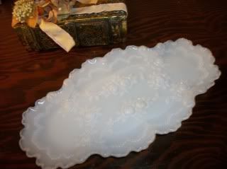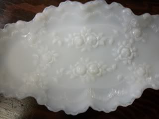 I would like to pick your brains for an ID on this piece. It's opaque white glass...more opalescent. Definitely not what I see as milkglass. A pattern of open roses with leaves. and beautiful scalloped edges.